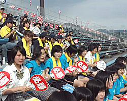 日野の保護者会の演奏に合わせて歌う生徒ら(彦根球場)